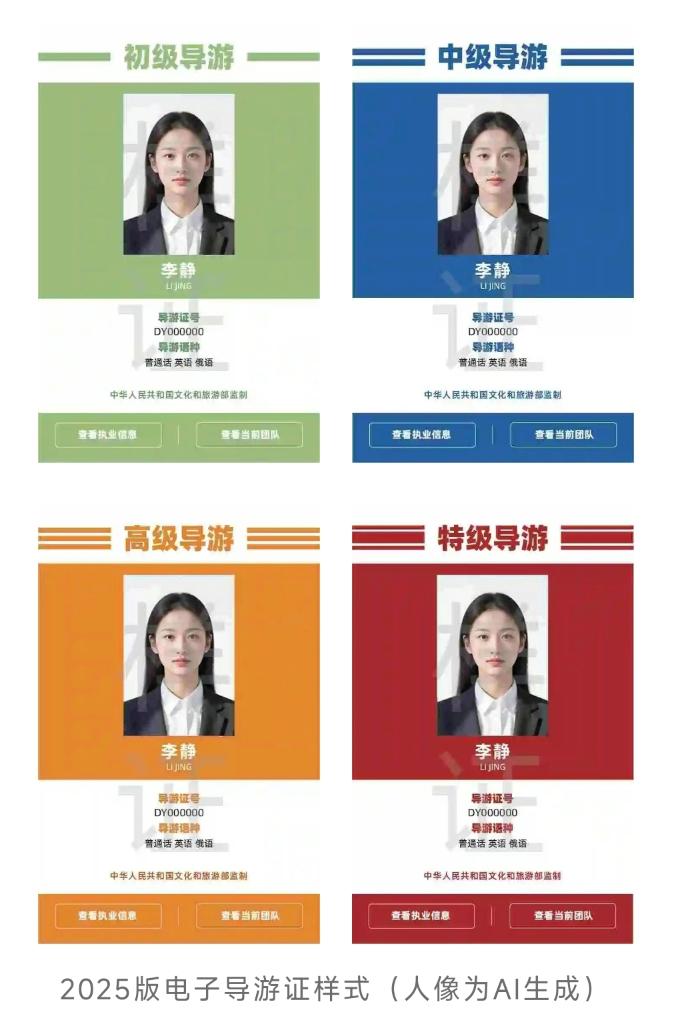 2025版电子导游证及导游身份标识卡均采取竖版证件样式,证件主色调按照导游等级进行区分:初级导游为绿色、中级导游为蓝色、高级导游为橙色、特级导游为红色。