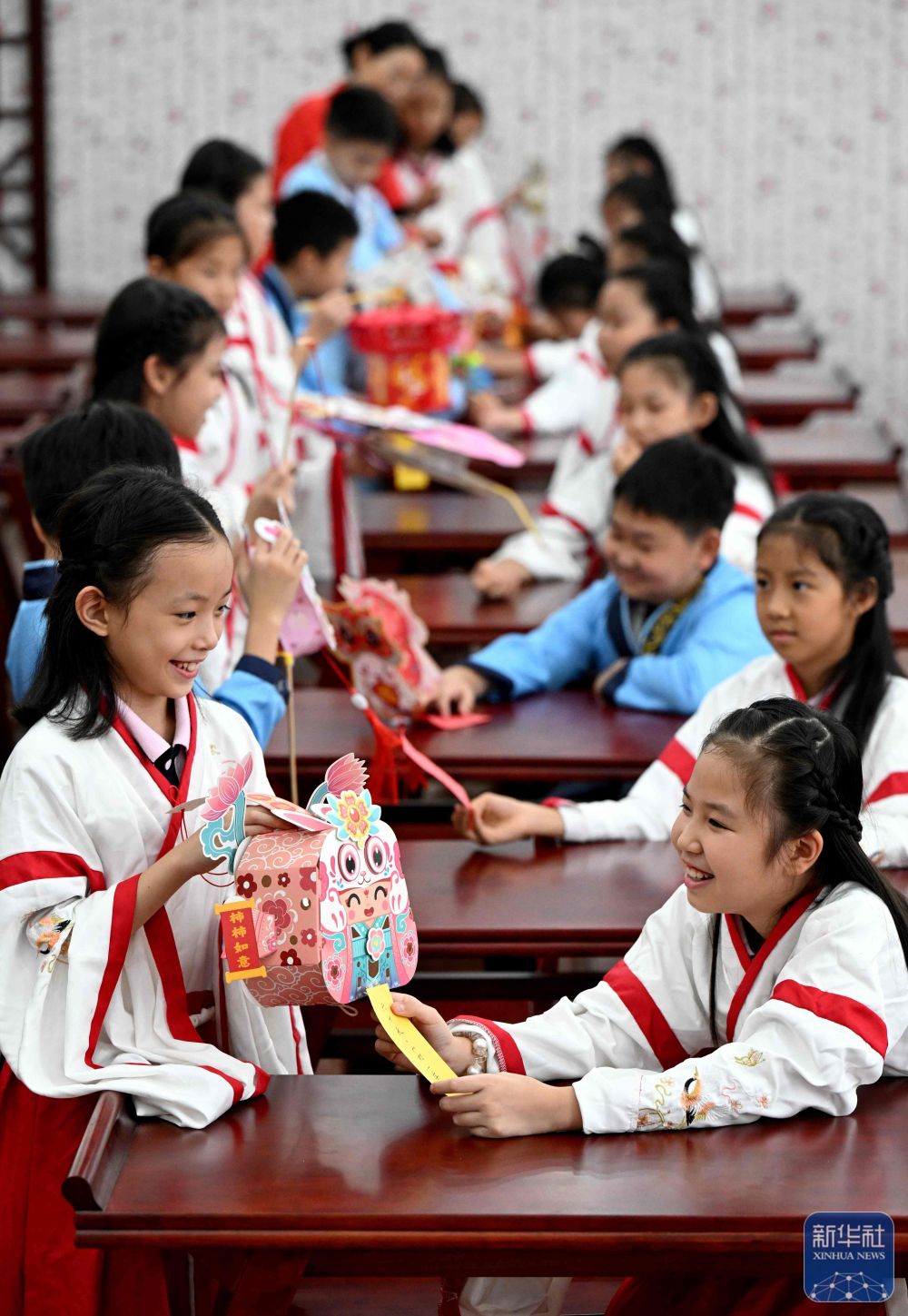 9月8日,在河北省石家庄市北郡小学迎中秋系列民俗主题活动中,学生们在猜灯谜。新华社发(陈其保摄)