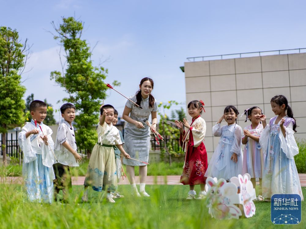 9月8日,在江苏省兴化市文林幼儿园,小朋友们进行投壶比赛。新华社发(周社根摄)