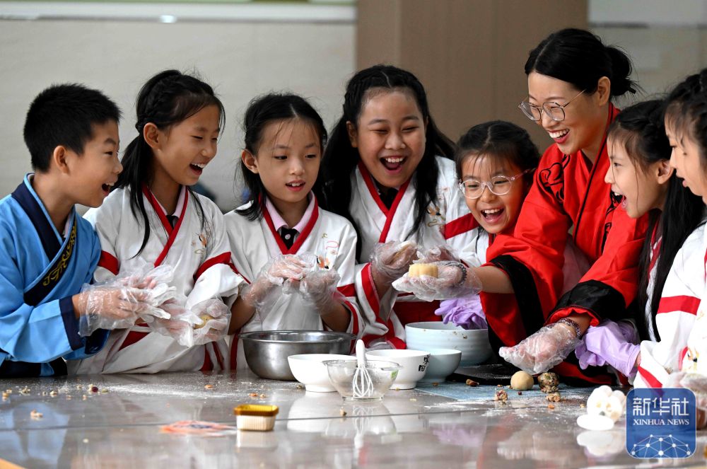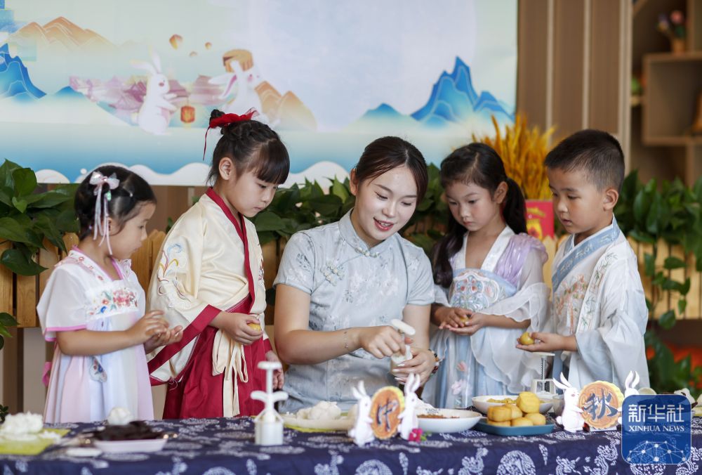 9月8日,在河北省石家庄市北郡小学,小朋友在老师的指导下制作月饼。新华社发(陈其保摄)