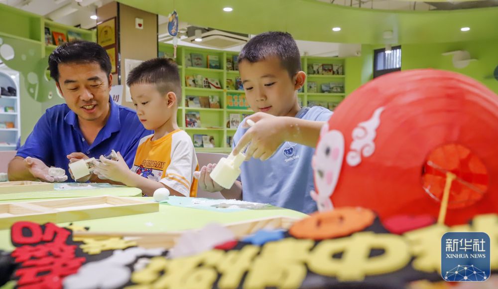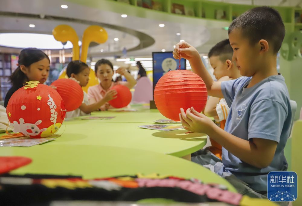 9月8日,在河北省遵化市新华书店举行的儿童迎中秋主题活动中,工作人员和小朋友一起做灯笼。新华社发(刘满仓摄)