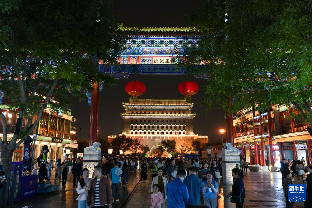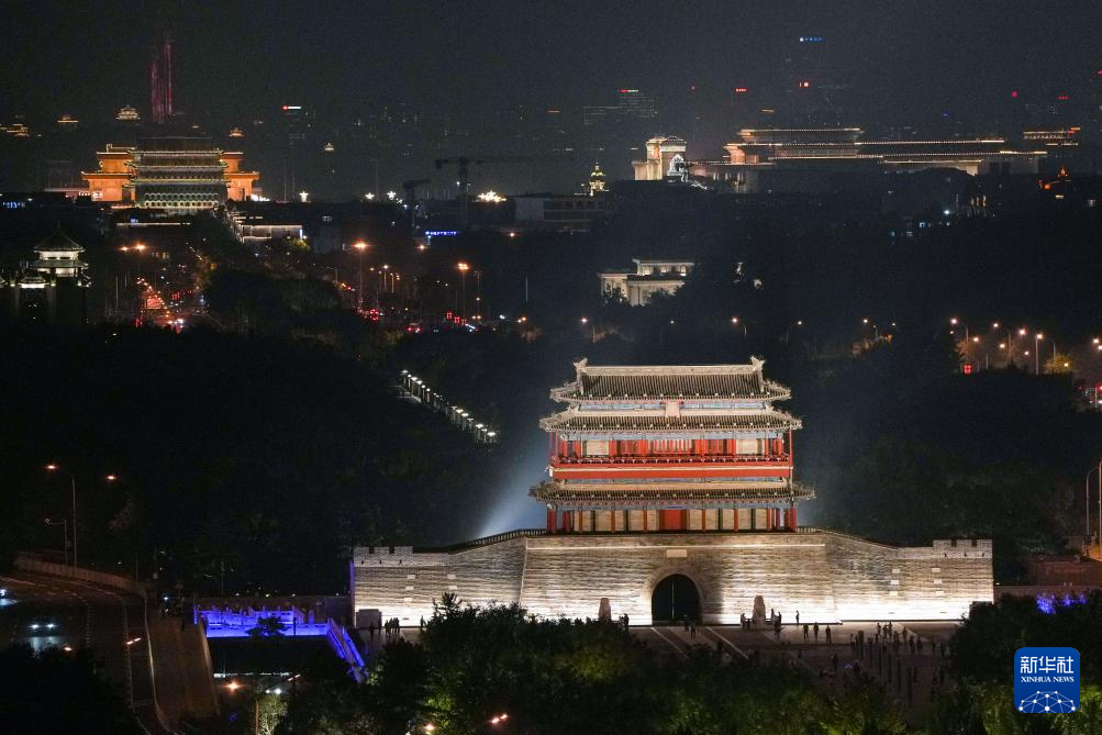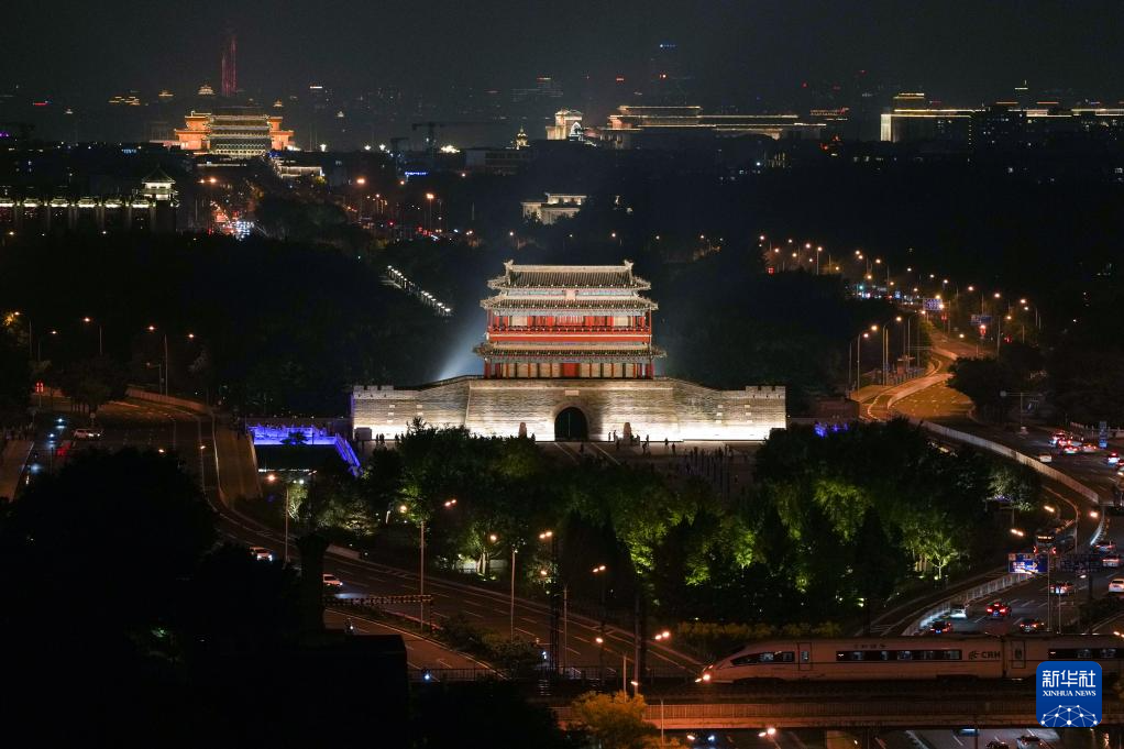 9月26日拍摄的完成景观照明设施提升后亮灯的永定门城楼和中轴线上的建筑。新华社记者 鞠焕宗 摄