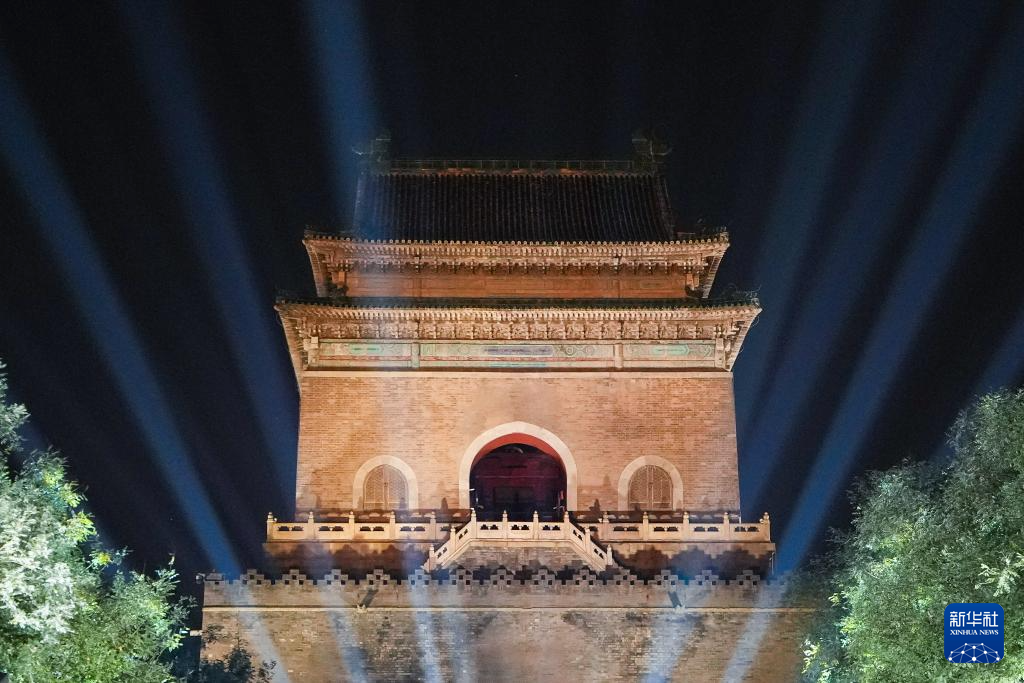 9月26日拍摄的完成景观照明设施提升后亮灯的鼓楼和钟楼。新华社记者 鞠焕宗 摄