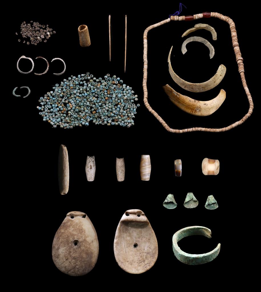 西藏康马玛不错遗址出土的第二期遗物(石质、骨质、金属装饰品,骨针、滑石珠、红玉髓、玻璃珠等)。(全国十大考古新发现活动办公室供图)