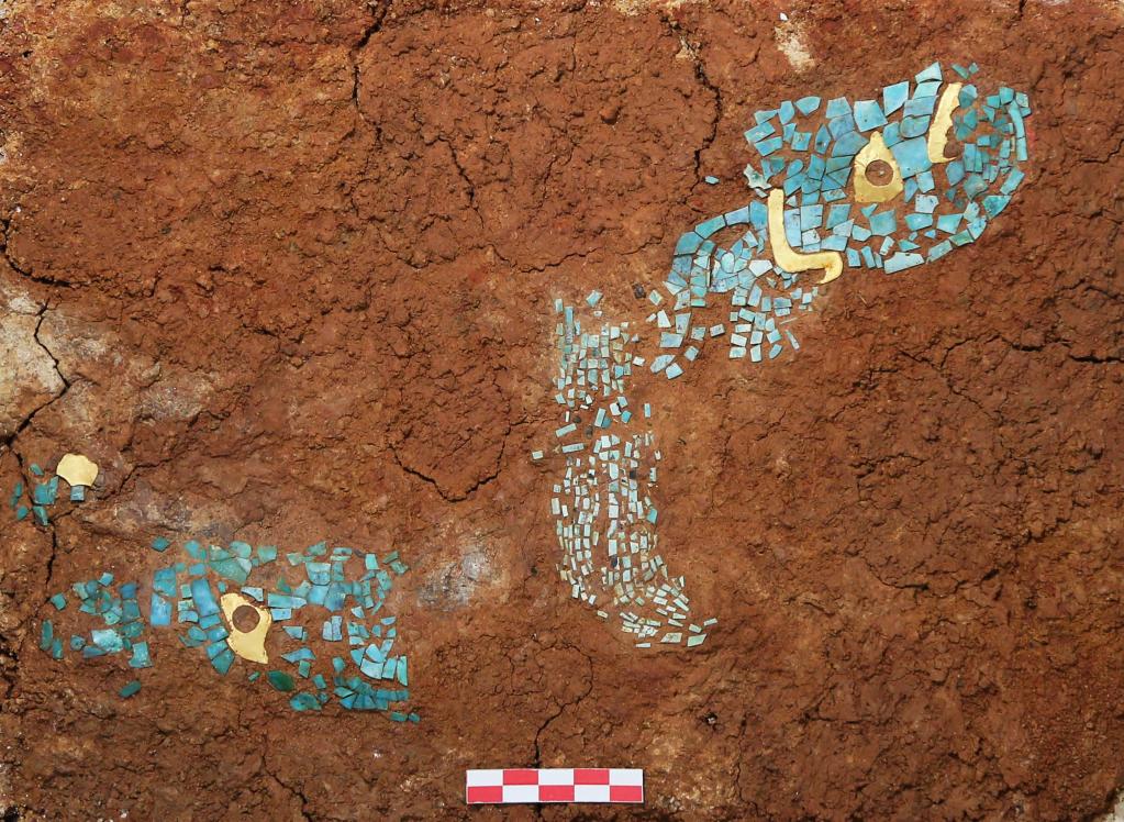 湖北黄陂盘龙城遗址杨家湾M17出土的金片绿松石镶嵌饰。(全国十大考古新发现活动办公室供图)