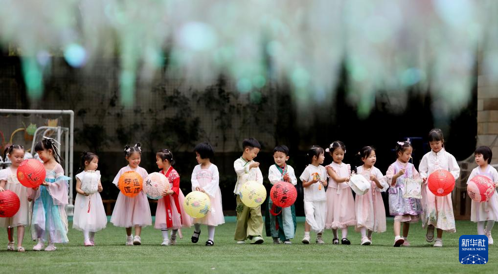 9月30日,江苏苏州高新区实验幼儿园的小朋友手提中秋花灯游园。新华社发(杭兴微摄)