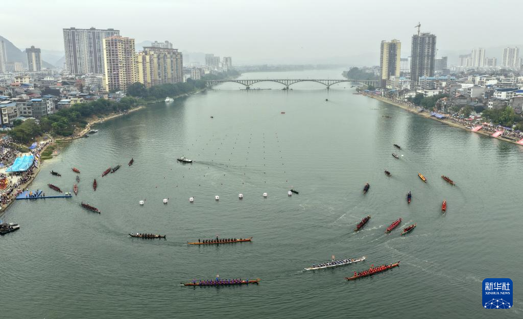 9月30日,在广西柳州市融安县迎国庆龙舟大赛中,参赛队伍在比赛中(无人机照片)。新华社记者 黄孝邦 摄