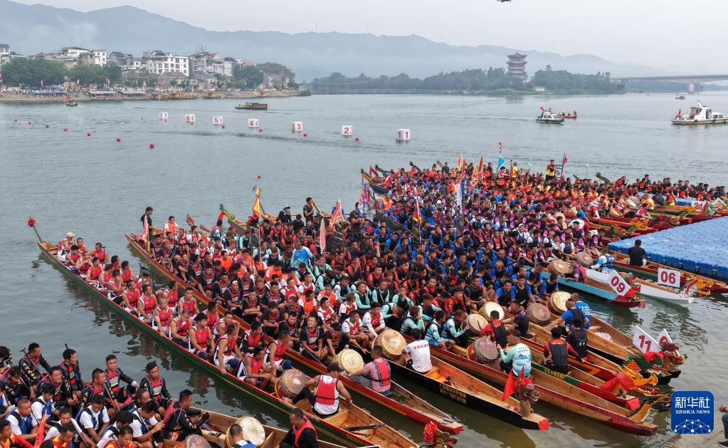 9月30日,在广西柳州市融安县迎国庆龙舟大赛中,参赛队伍在融江河上准备比赛(无人机照片)。新华社记者 黄孝邦 摄