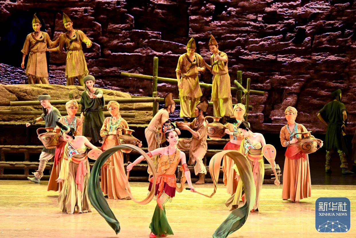 ↑ 10月3日晚,在甘肃省敦煌大剧院,演员在经典舞剧《大梦敦煌》中表演。新华社发(张晓亮摄)