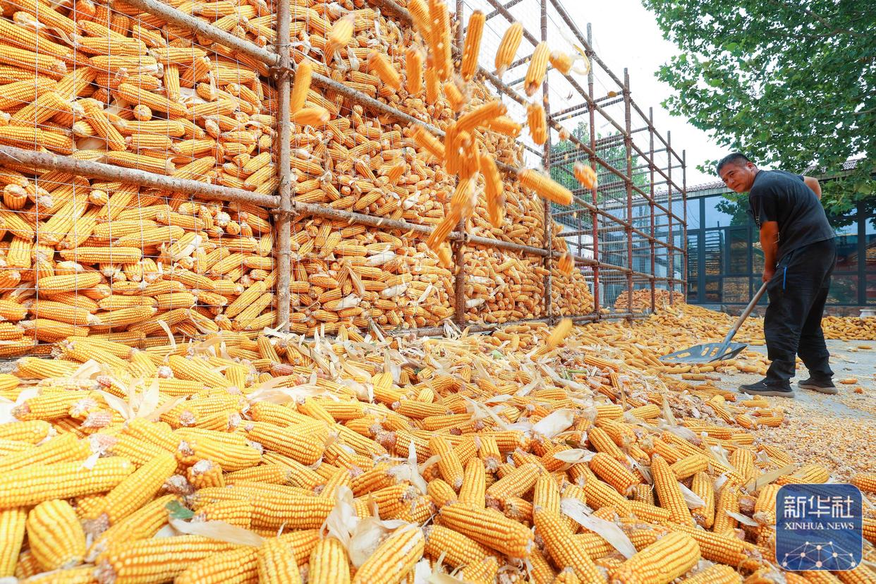 ↑ 10月4日,河北省石家庄市藁城区绿之宝家庭农场的农民将收获的玉米进行打垛储藏。新华社发(张晓峰 摄)