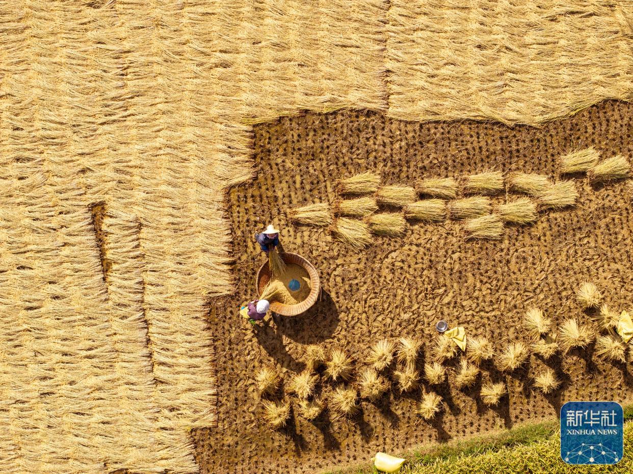↑ 10月3日,农民在云南省大理白族自治州洱源县右所镇收割水稻(无人机照片)。新华社发(罗新才摄)