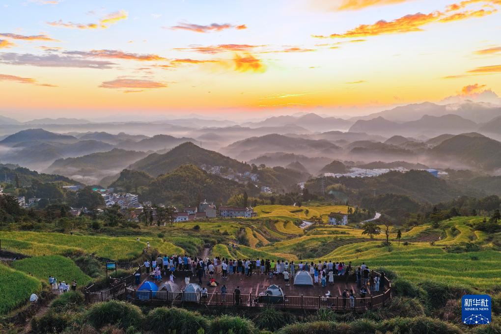 10月4日清晨,游客聚集在浙江省台州市天台县泳溪乡北山村的鎏金梯田观景台拍摄日出(无人机照片)。新华社发(林利军摄)