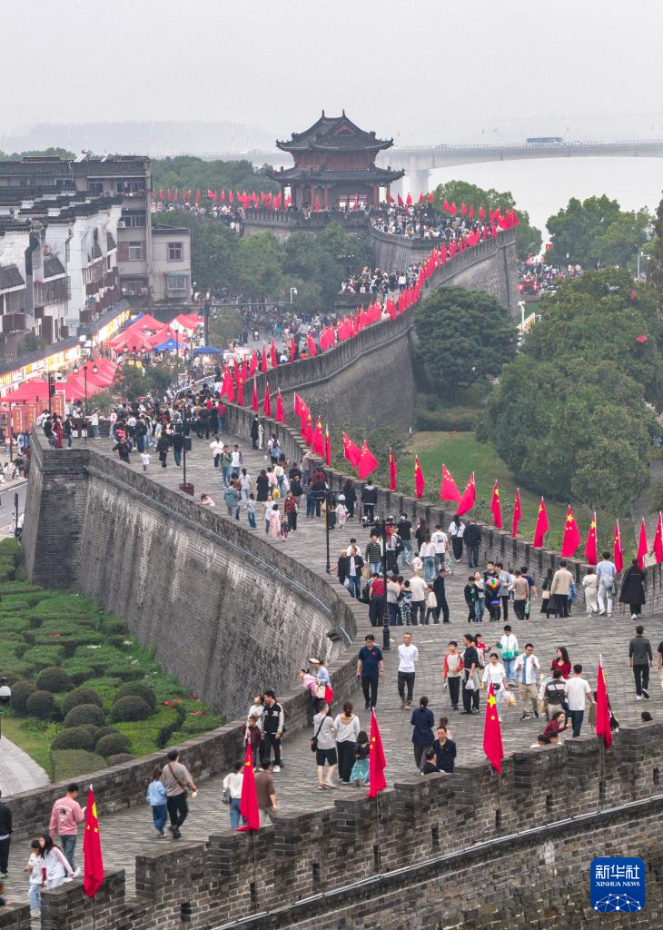 10月4日,游客在湖北省襄阳古城游玩(无人机照片)。新华社发(杨东摄)