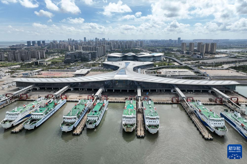 10月7日,在海南省海口市新海港,车辆有序驶入客滚船(无人机照片)。新华社记者 张丽芸 摄
