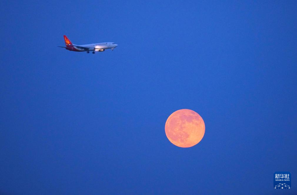 10月7日,在浙江省温州市龙湾区上空,一架飞机与月亮相映成趣。新华社发(苏巧将摄)