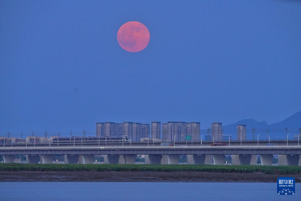 10月7日,在浙江省温州市龙湾区瓯江上,列车驶过时与月亮同框。新华社发(苏巧将摄)