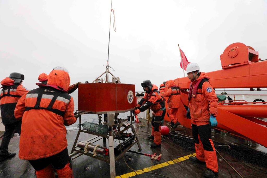 队员们在艉甲板回收Lander。新华社记者刘诗平 摄