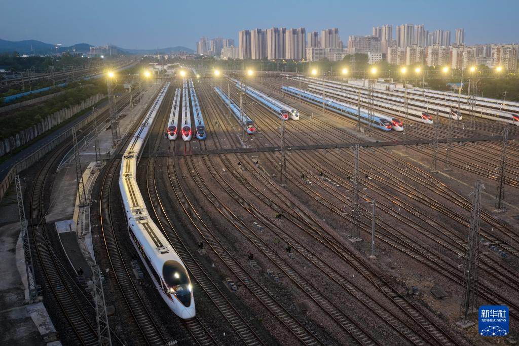 10月10日拍摄的停靠在南京动车段南京南动车运用所存车线上的列车(无人机照片)。新华社发(杨素平摄)