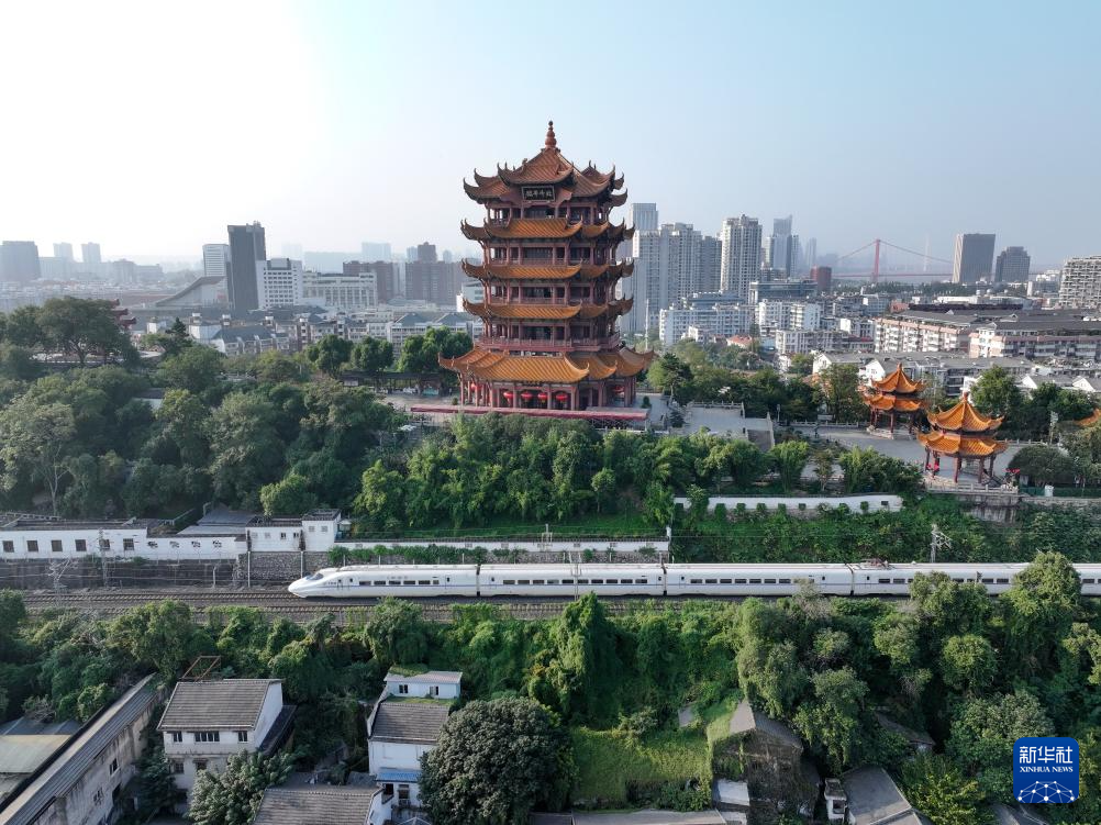 10月10日,动车组列车经过湖北省武汉市黄鹤楼(无人机照片)。新华社发(赵军摄)