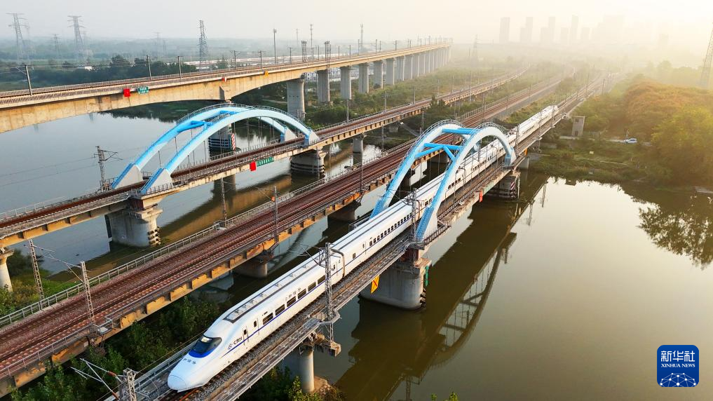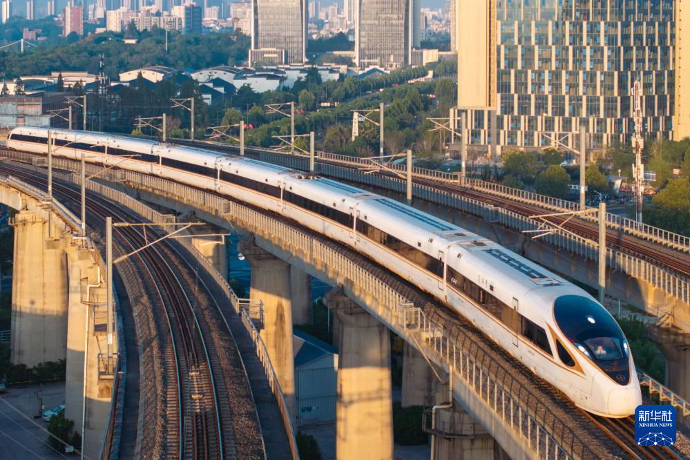 10月10日在江苏南京拍摄的行驶中的动车组列车(无人机照片)。新华社发(苏阳摄)