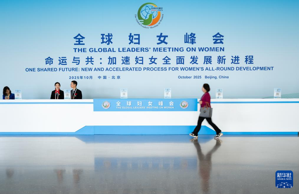 10月13日,在北京国家会议中心,一位女士经过全球妇女峰会服务台。新华社记者 杜子璇 摄
