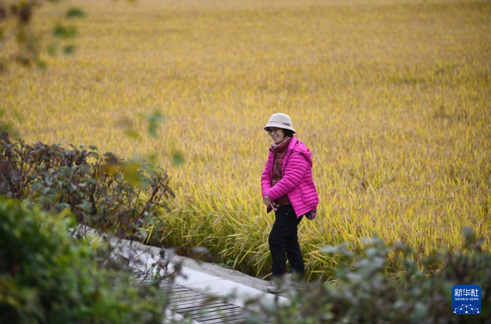 10月16日,游人在南泥湾稻田游览。新华社记者 张博文 摄