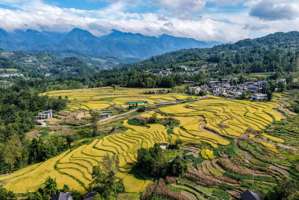 9月18日拍摄的重庆市黔江区五里镇梯田景色(无人机照片)。地处武陵山区腹地的重庆市黔江区五里镇水稻种植面积5300亩,是武陵山地区粮食主要产区之一。新华社记者 唐奕 摄