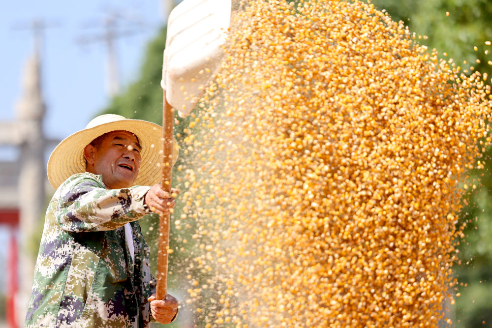 10月16日,山东省枣庄市孟庄镇刘岭村农民扬晒收获的玉米。新华社发(孙中喆 摄)
