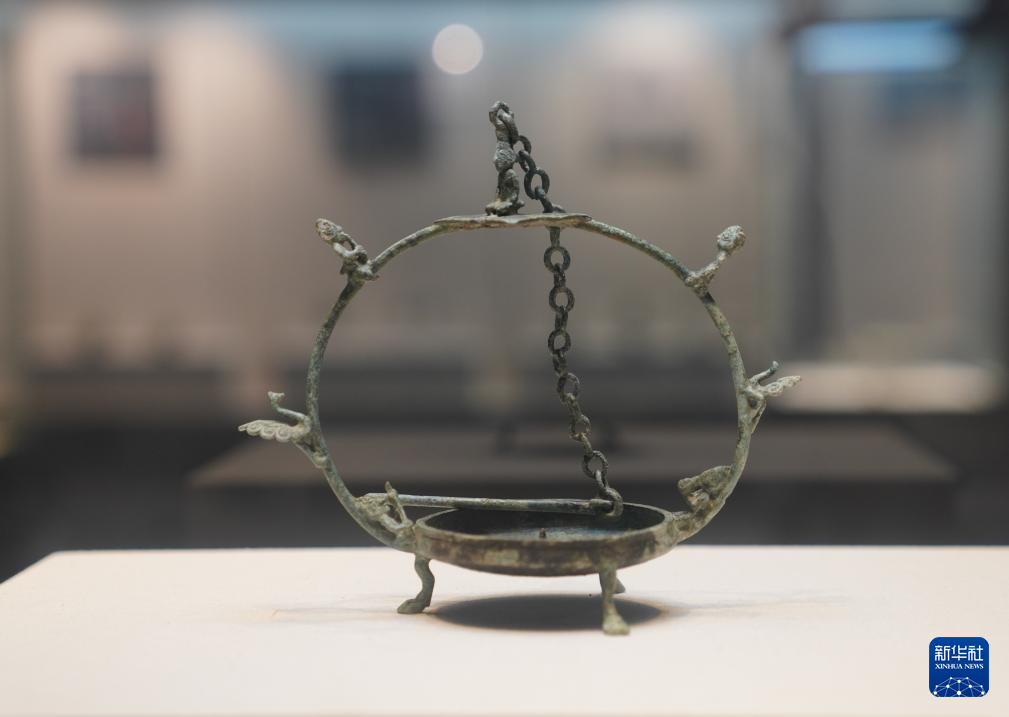 这是10月21日在广西合浦汉代文化博物馆拍摄的活链提梁铜灯。新华社记者 周佳谊 摄