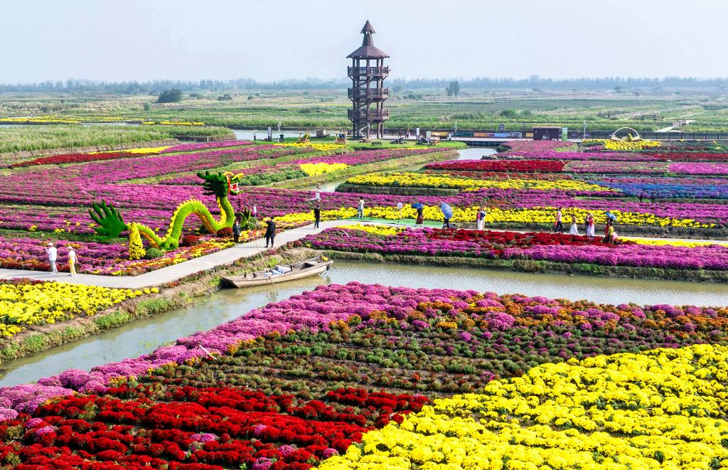 2025年10月13日,游客在江苏省兴化市千垛景区赏菊游玩(无人机照片)。新华社发(周社根 摄)