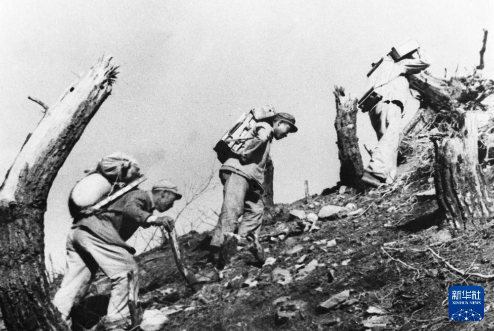 在上甘岭战役期间,中国人民志愿军战士突破敌人的火力封锁,将弹药补给等送往前沿阵地。