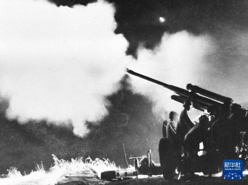 在上甘岭战役中,中国人民志愿军高射炮部队在夜间猛烈射击敌机。