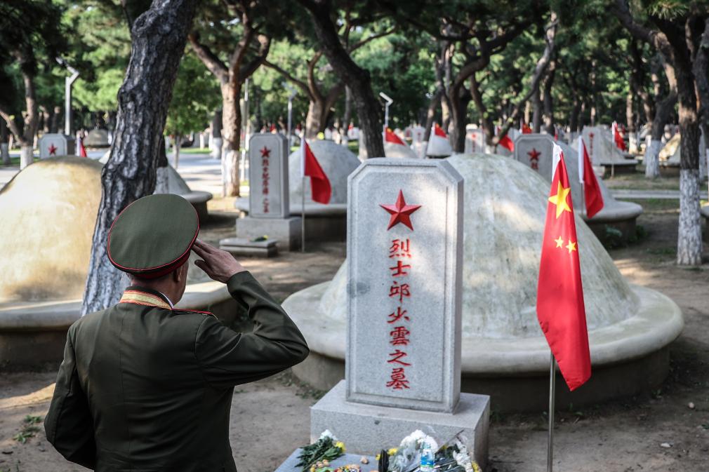 2025年9月10日,在沈阳抗美援朝烈士陵园,抗美援朝老战士向烈士墓敬礼,祭奠英烈。新华社记者潘昱龙摄