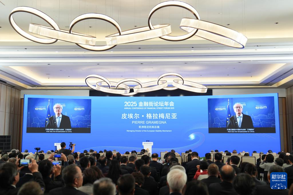 10月27日,在2025金融街论坛年会开幕式上,欧洲稳定机制总裁皮埃尔·格拉梅尼亚发表视频主题演讲。新华社记者 鞠焕宗 摄