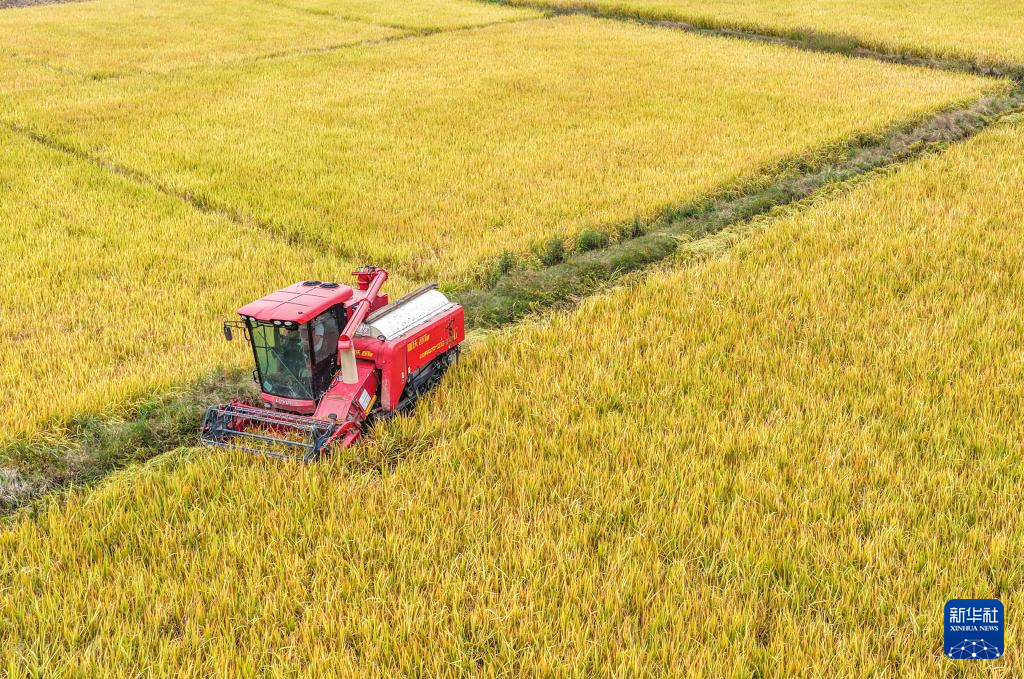 10月28日,湖南省永州市道县梅花镇棠下村,农机手驾驶机械收割晚稻(无人机照片)。新华社发(蒋克青 摄)