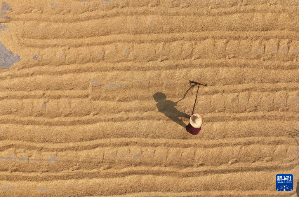 10月28日,在湖南省衡阳市衡山县白果镇,当地村民晾晒稻谷(无人机照片)。新华社发(曹正平 摄)
