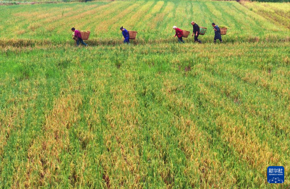 10月26日,在四川省眉山市仁寿县慈航镇观音社区,村民在转运收获的再生稻(无人机照片)。新华社发(潘建勇 摄)