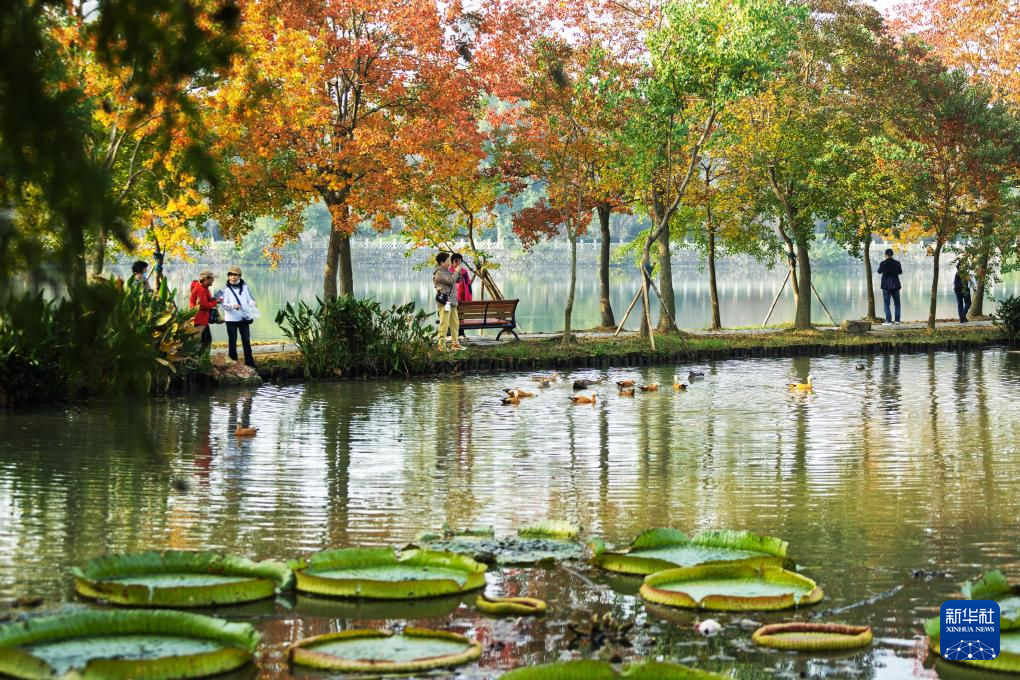 11月2日,人们在南京中山植物园月牙堤上观赏秋景。新华社发(孙忠南 摄)