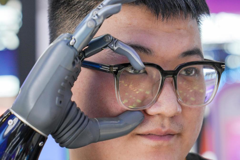 7月17日,在第三届中国国际供应链促进博览会数字科技链展区,一名右手残疾的工作人员佩戴智能仿生手后摘取眼镜。