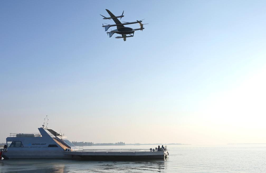 11月22日,在江苏昆山的峰飞航空全球科技日活动中,一架电动垂直起降飞行器从“水上机场”起飞。
