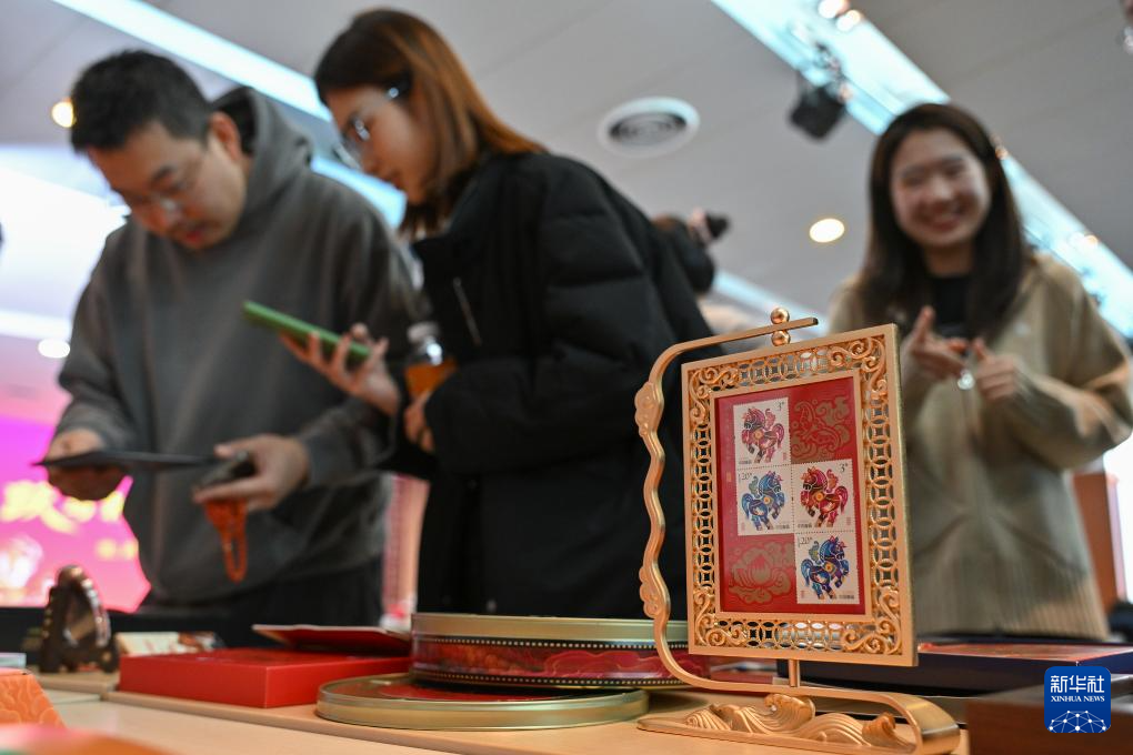 1月29日,工作人员展示活动现场发布的《跃马乾坤 八方来财》雕刻版生肖主题邮票珍藏摆件(左)和《骏驰元宇》邮票珍藏册。新华社记者 李鑫 摄