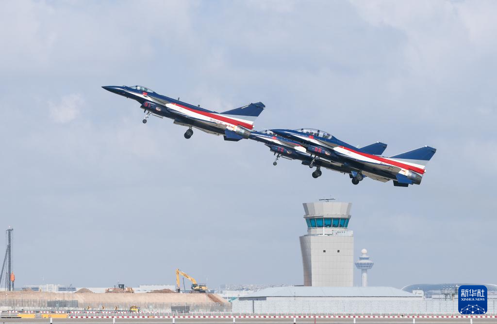 2月1日,在新加坡樟宜展览中心举行的新加坡航展媒体预演上,中国空军八一飞行表演队进行检验性飞行。新华社发(陈恺泽摄)