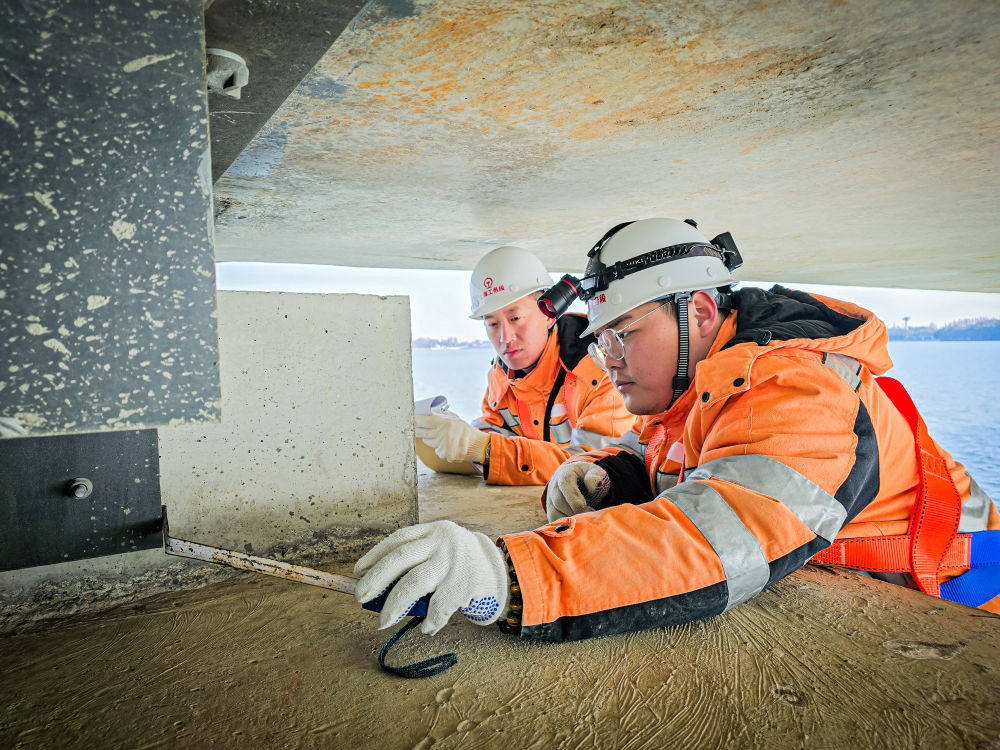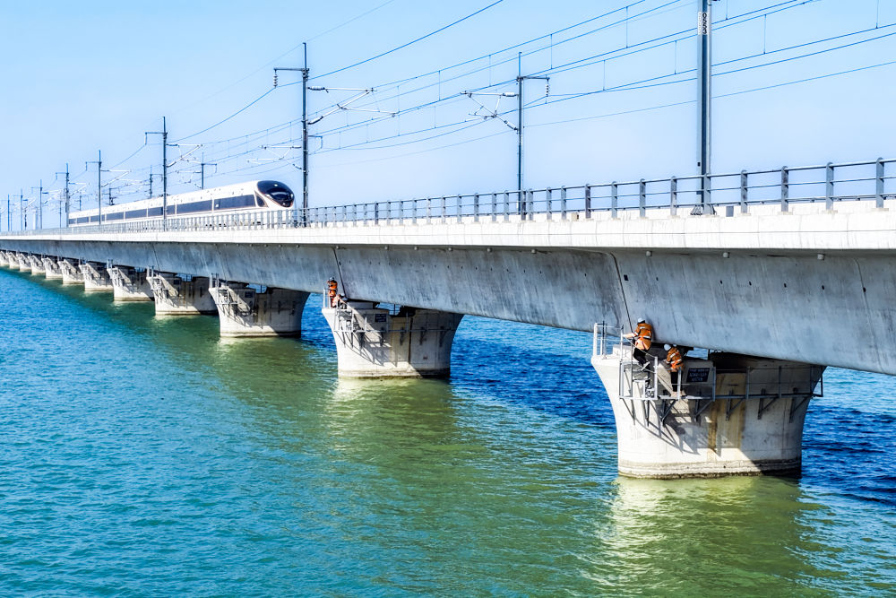 春运期间,上海高铁基础设施段湖州车间桥梁组工作人员在沪苏湖高铁元荡湖段进行检修作业。
