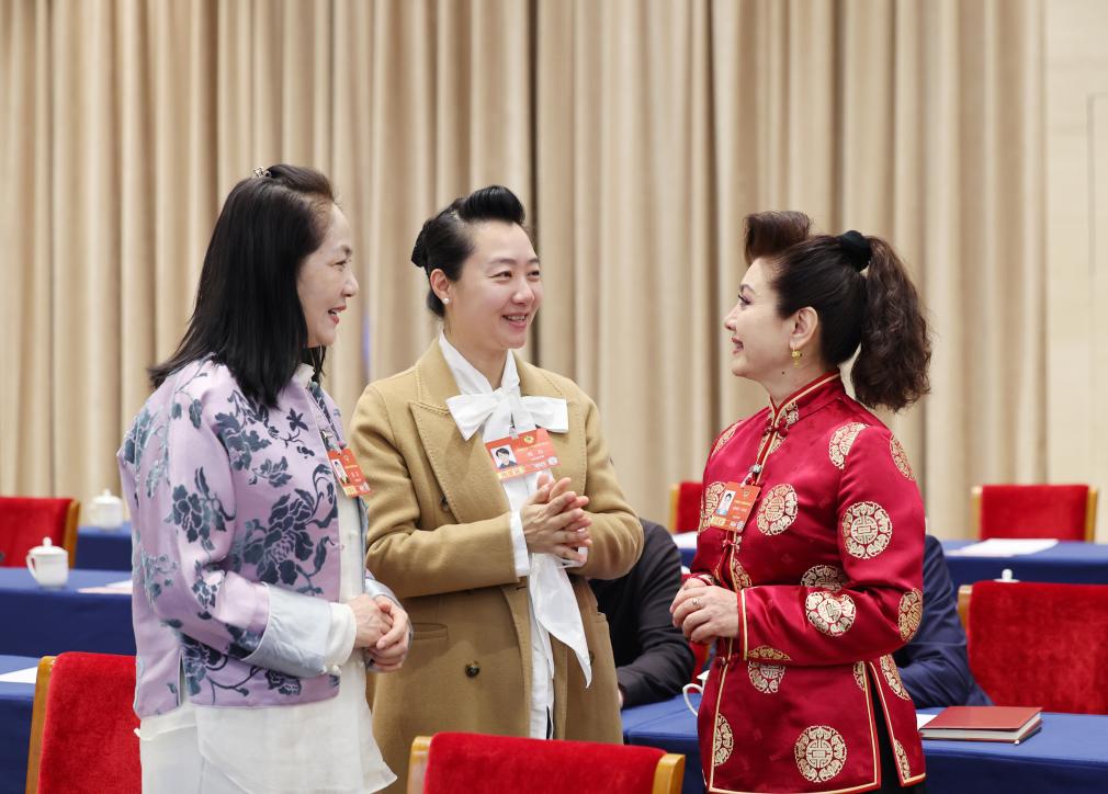 3月6日,十四届全国人大四次会议天津代表团举行开放团组会议。这是郭红静代表(中)在会前和其他代表交流。新华社记者 蔡湘鑫 摄