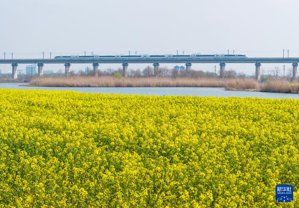 春日,在安徽省合肥市肥东县十八联圩生态湿地,油菜花竞相绽放,铺展成金色花海。高铁列车穿行其间,与碧水、飞鸟相映成趣,勾勒出一幅生动多彩的江淮大地春日图景。