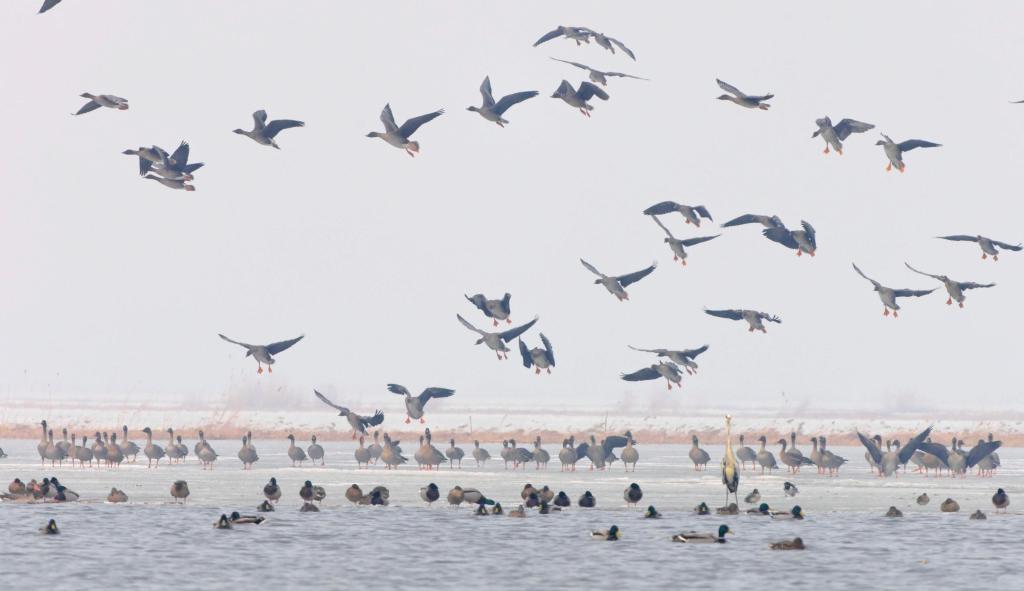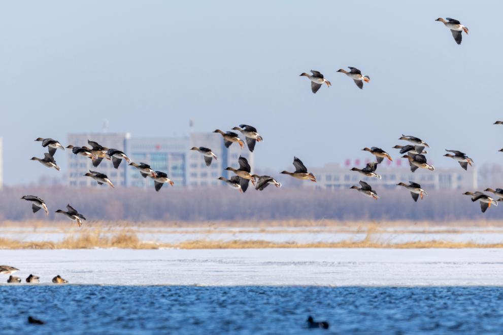 3月9日,在位于黑龙江省鸡西市的兴凯湖国家级自然保护区,一群豆雁在冰面上起飞。新华社发(孙海淇摄)