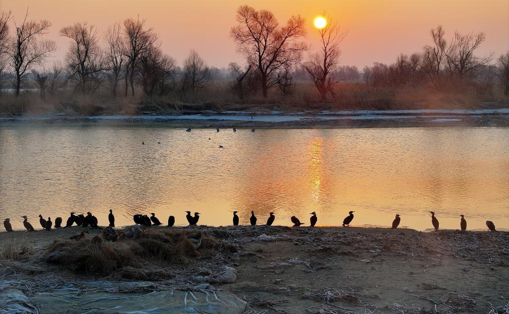 3月11日,飞抵松花江哈尔滨段的候鸟在晨光中休息。新华社发(张树摄)