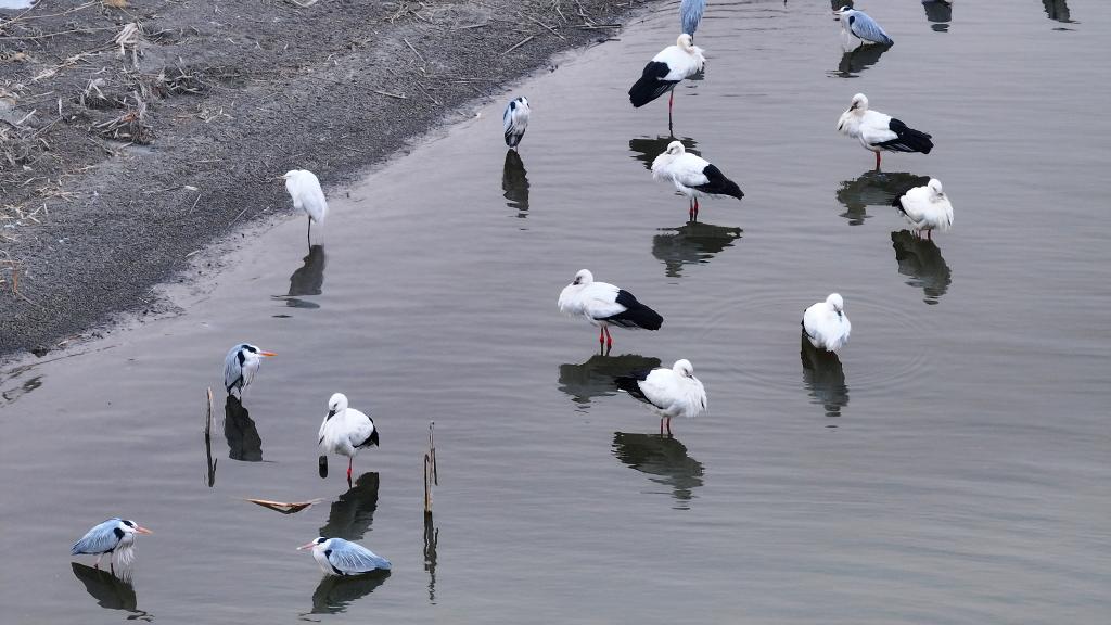 3月18日,东方白鹳和苍鹭等鸟类在松花江哈尔滨段一处水域休憩觅食。新华社发(杨威摄)