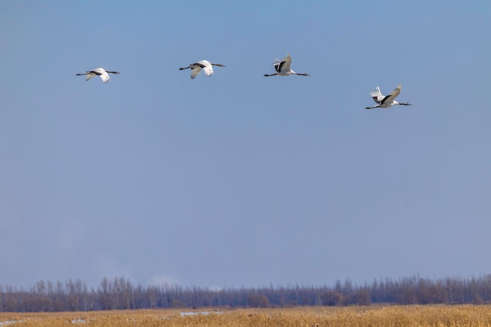 3月17日,丹顶鹤在位于黑龙江省双鸭山市宝清县境内的七星河国家级自然保护区湿地上空飞翔。新华社发(韩阳摄)