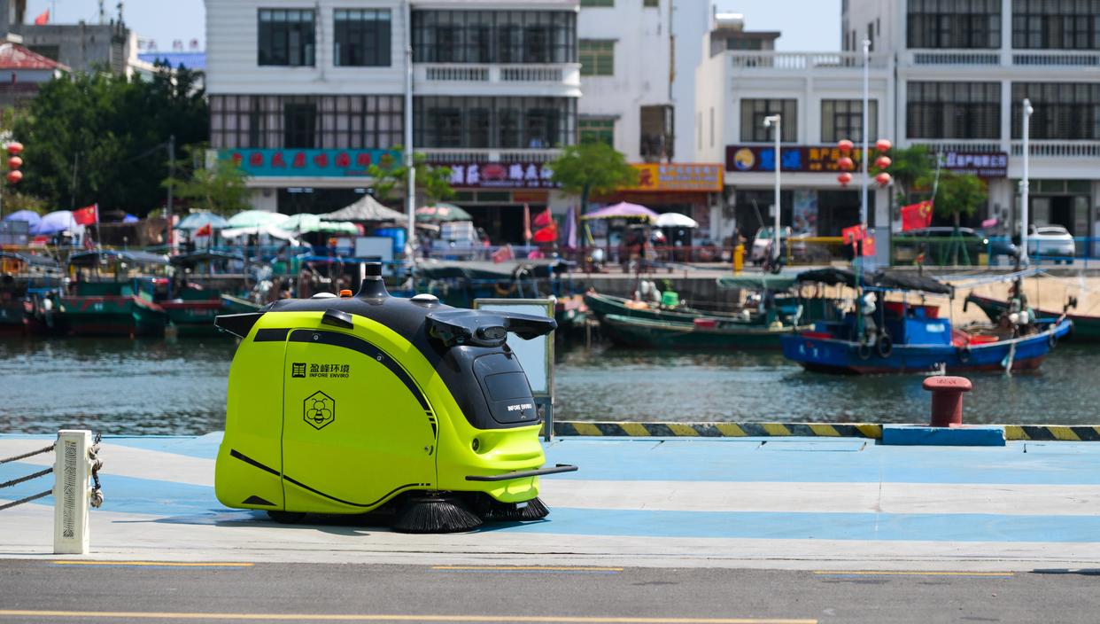 小蜜蜂智慧清洁机器人在位于海南省琼海市潭门镇排港村作业(3月25日摄)。新华社记者 杨冠宇 摄